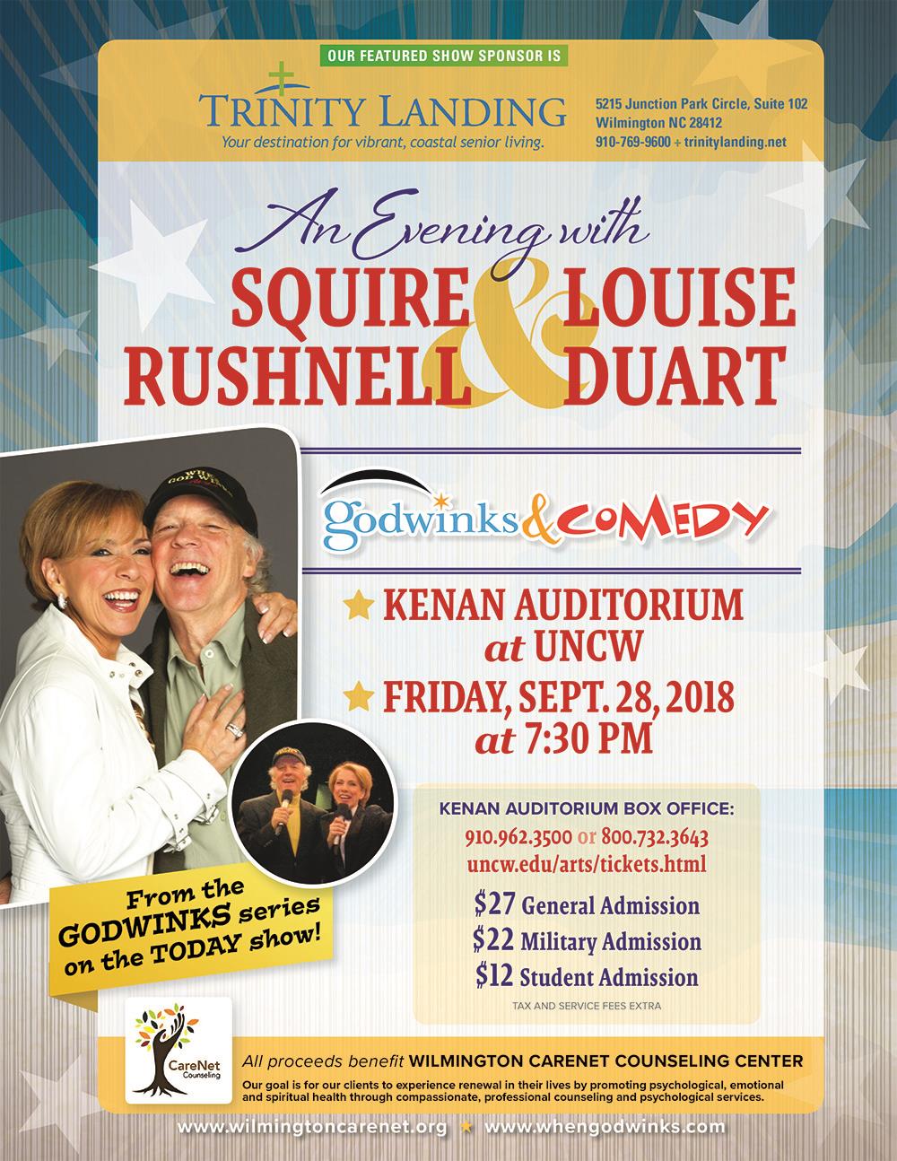 September 28th Performing Live at Kenan Auditorium Squire Rushnell and Louise DuArt. Squire is the New York Times bestselling author of Ten Godwinks books and is a monthly contributor to NBC TODAY. During Christmas 2018 the Hallmark Channel will premiere the Godwinks Movie Series. While with ABC TV, Squire led the way to over 75 Emmy’s for Schoolhouse Rock and ABC Afterschool Specials. Louise has starred on Broadway, toured nationally as a Women of Faith speaker and for 8 seasons, hosted the ABC Family Channel program, Living the Life. Louise is one of the world’s top comedic impressionists and costarred on tour for 15 years with the legendary Tim Conway and Harvey Korman. Today Squire and Louise love performing together in Godwinks and Comedy. Lifting the hearts and encouraging audiences, Louise weaves her humorous characters among Squire’s inspiring Godwink stories. All ticket sales benefit WILMINGTON CARENET COUNSELING CENTER