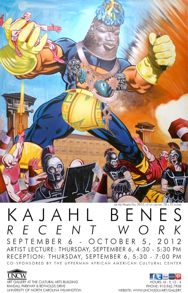 Recent Work, co-sponsored by the Upperman African American Cultural Center, is the first solo exhibition by recent Hunter College Master of Fine Arts graduate, Kajahl Benes. A California native, Benes’ oil paintings merge icons from parallel histories along with his own constructed mythology prodding the viewer to re-examine mainstream historical paradigms. Re-appropriating African tribal costumes, ancient Roman military attire, and science fiction iconography, Benes references traditional Western portraiture, contemporary technology, and questions both the legitimacy of past records and the direction of future cultures.